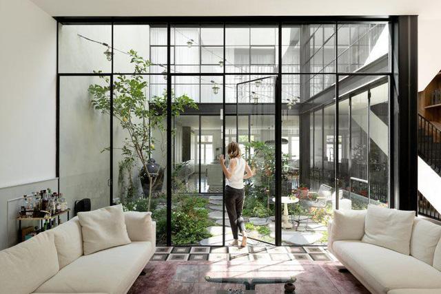 Thay vì xây thêm các bức tường kín bao quanh khu vườn, các kiến trúc sư sử dụng cửa khung thép, mặt kính để thay đổi diện mạo ngôi nhà từng bị bỏ hoang.