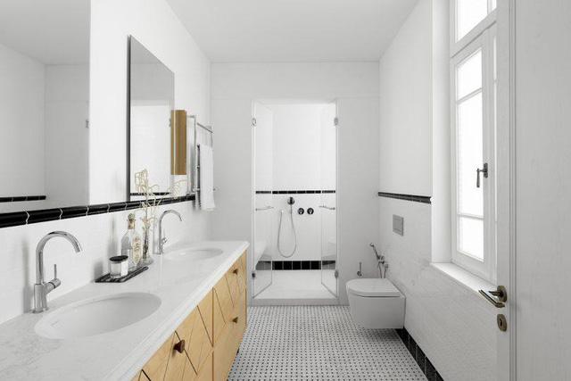 Nhà vệ sinh lắp đặt nhiều gương lớn để không gian nhìn rộng rãi hơn.