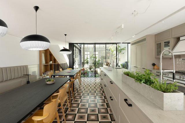 Tại tầng 1, đảo bếp kéo dài theo diện tích của khu vực ăn uống và bàn đọc sách, tiếp giáp với khu vườn ở sân trong.
