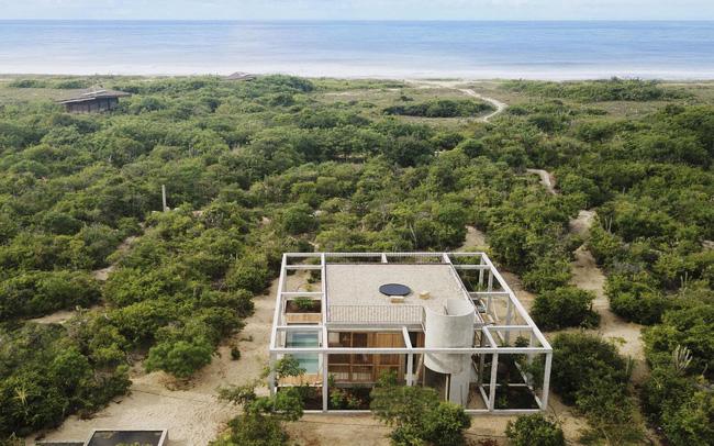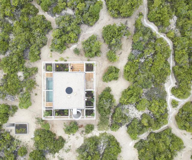 Nền móng có sức chịu tải nâng ngôi nhà lên, giải phóng địa hình và địa vật bên dưới, để dòng nước, không khí, động thực vật tự nhiên không bị tác động. Trong khi đó, lưới bê tông bên ngoài ôm lấy ngôi nhà và kết hợp các thảm thực vật hiện có, làm cho các điểm giữa kiến trúc và cảnh quan không bị xác định và biến đổi theo mùa.