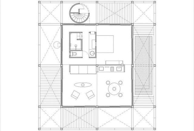 Các kiến trúc sư chia ngôi nhà thành 3 phần. Phần đầu tiên và quan trọng nhất là trung tâm ngôi nhà được xây dựng bằng các tấm bê tông và cột với lớp hoàn thiện thô. Phần trung tâm bao gồm 1 phòng ngủ, phòng bếp, phòng sinh hoạt và phòng tắm. Mỗi một phòng chức năng chiếm một ¼ diện tích của phần trung tâm.